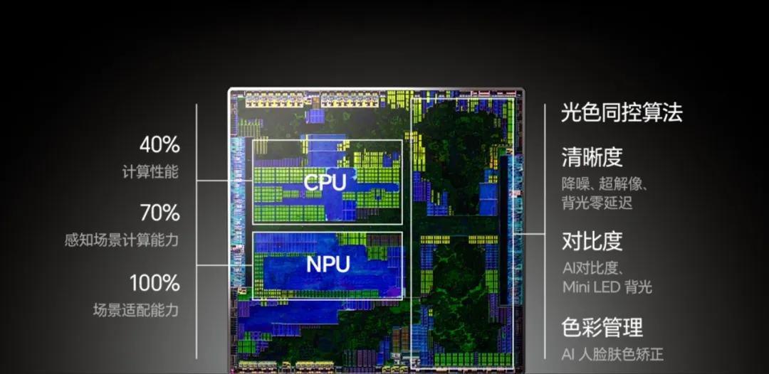 在画质芯片层面,信芯H7的创新之处在于其采用了RISC-V开放架构,并集成了专用的NPU单元。这种架构使得H7芯片能够支持行业最高的3×10240分区控制能力,是行业公版芯片处理能力的两倍。在实际应用中,这种强大的算力支撑使得E8S Pro能够实现"5090级独显"的画质处理能力,彻底解决了长期困扰高端电视的串色和光晕问题。