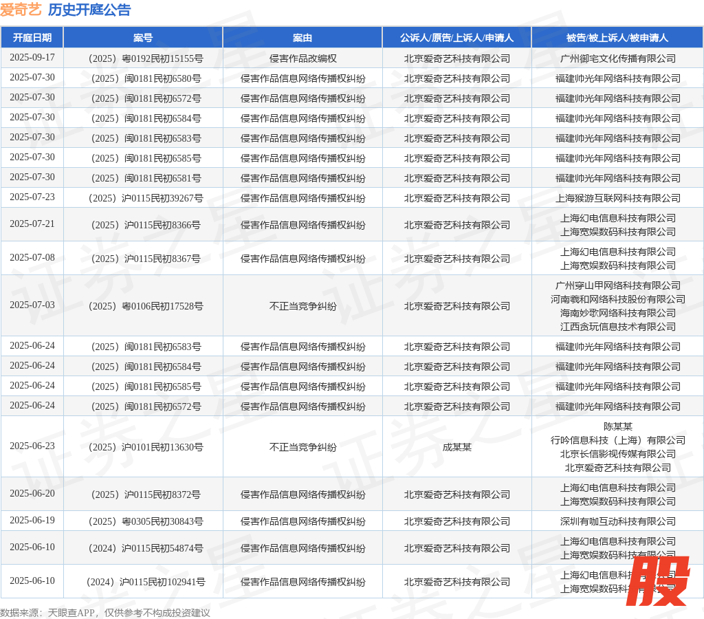 案号:(2025)粤0305民初30843号审理法院:广东省深圳市南山区人民法院案由:侵害作品信息网络传播权纠纷当事人信息: 原告/上诉人:北京爱奇艺科技有限公司 被告/被上诉人:深圳有咖互动科技有限公司开庭日期:2025年6月19日根据统计,近一年内以北京爱奇艺科技有限公司为当事人的历史开庭公告有479则,其中案由为“侵害作品信息网络传播权纠纷”的公告以381则居首,其次为“著作权权属、侵权纠纷”有32则,“不正当竞争纠纷”有18则。历史开庭公告(前20条)如下: