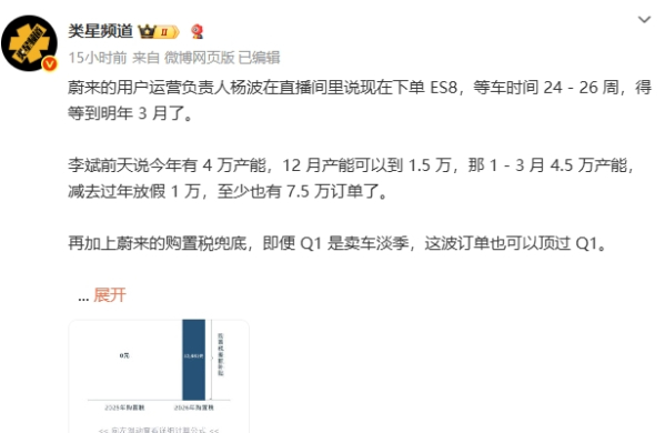 【智车派新闻】9月20日,蔚来汽车第三代ES8在杭州正式上市,起售价40.68万元,若采用BaaS电池租赁方案,价格下探至29.88万元。据智车派了解,由于市场反应过于火爆,新车上市仅数日便因订单量远超预期陷入产能困难。据蔚来用户运营负责人杨波在直播中透露,当前下单需等待24-26周(约6个月)恒盛策略,提车时间将延至2026年3月。